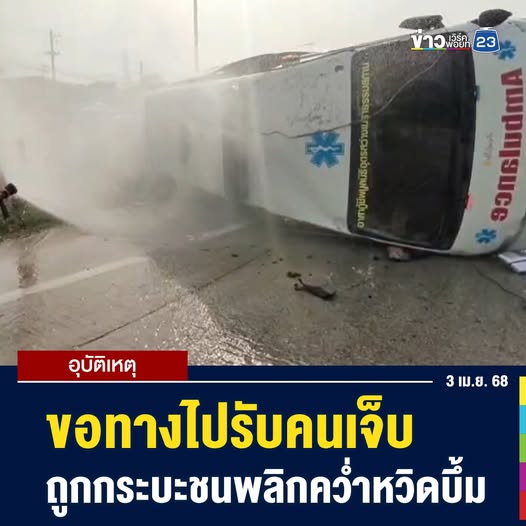 ระทึก! รถตู้อาสากู้ภัยฝ่าสัญญาณไฟไปรับคนเจ็บถูกกระบะชนพลิกคว่ำแก๊สรั่วหวิดบึ้ม